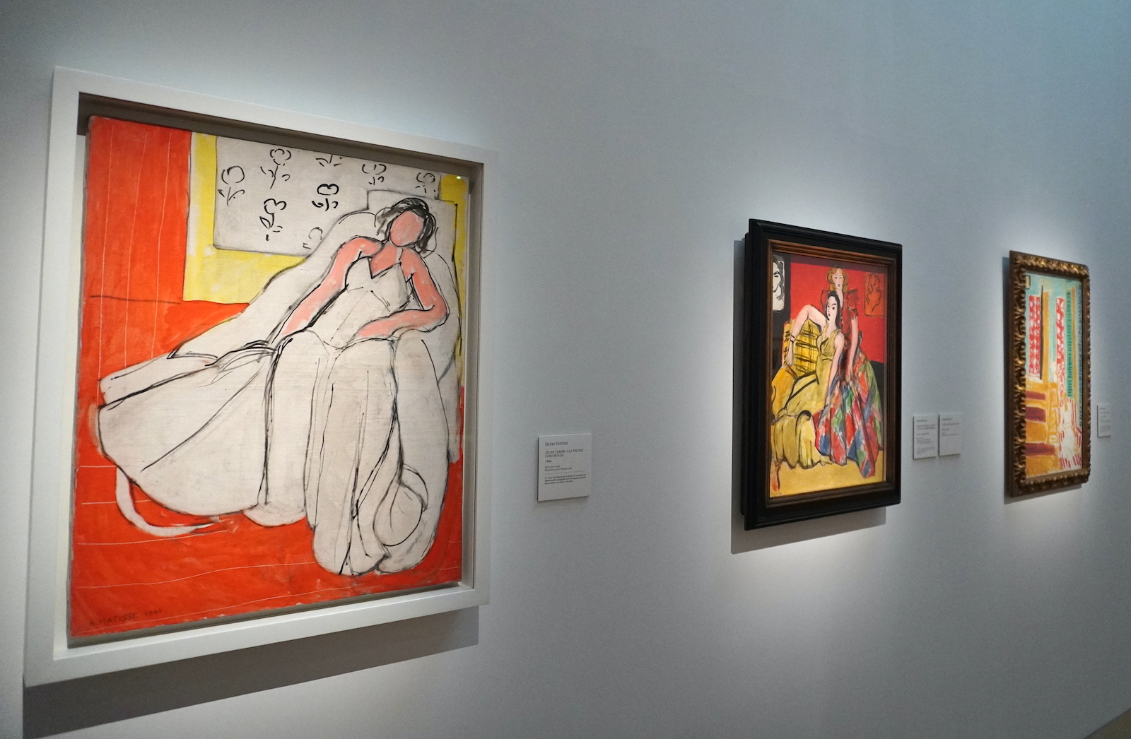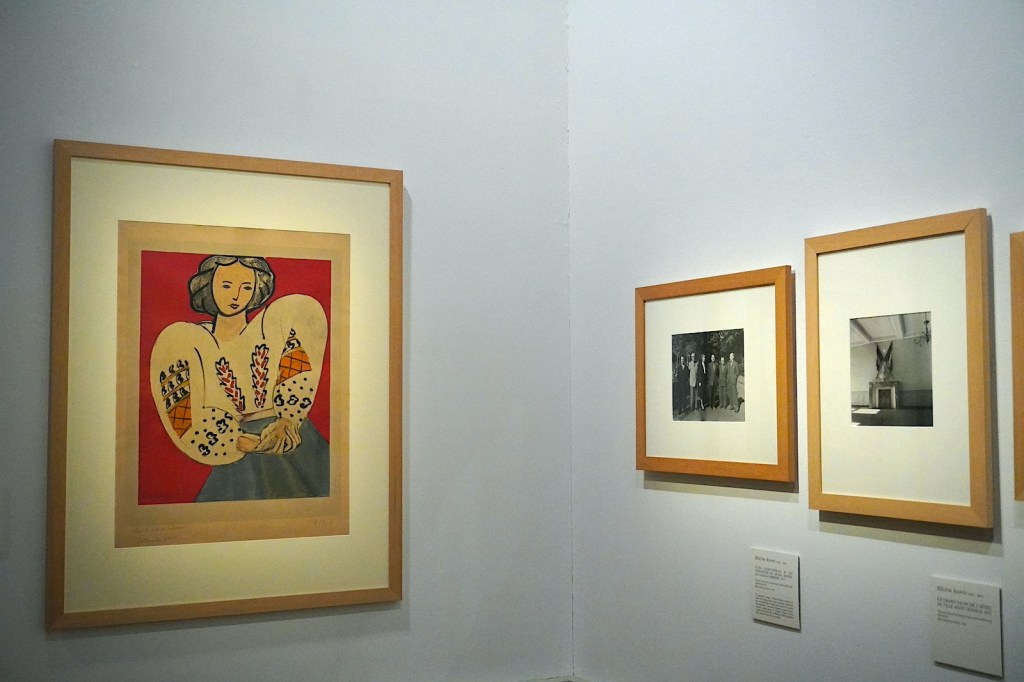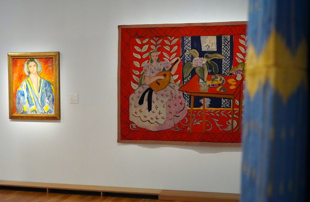 L’accrochage nous montre que le maître de la couleur était également passionné de tissus, qu’il collectionnait. Quoi de plus normal pour un descendant de tisserands ! Représentés dans des décors exubérants, ils servent la composition de ses toiles. Mais ces étoffes sont aussi vêtements, comme sur la lithographie « Blouse romaine » qui nous accueille au tout début de ce voyage. Tissu encore avec quelques pièces sorties de sa collection personnelle, comme cette majestueuse blouse « abbaya » du Proche-Orient, dont les motifs géométriques font écho avec le tableau tout proche.
