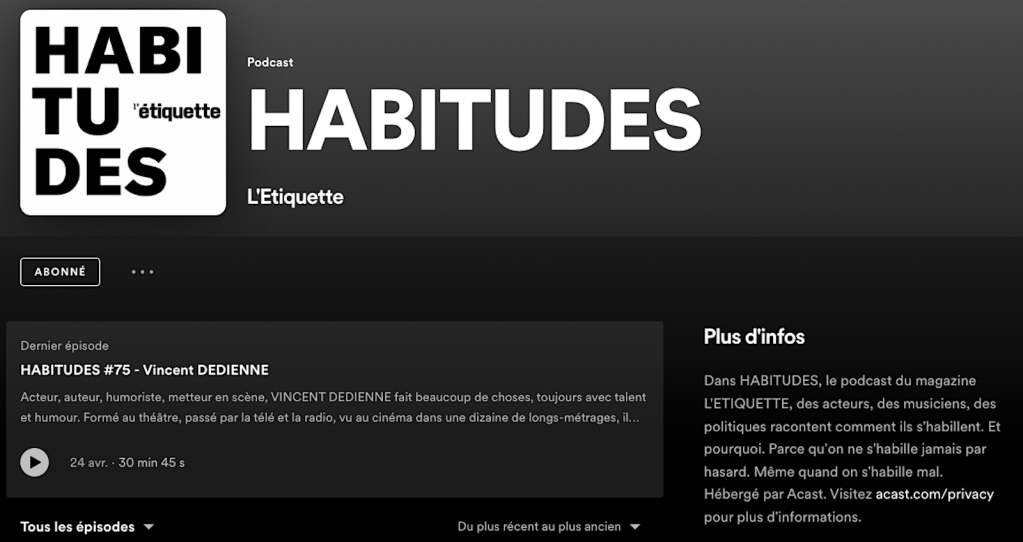 Tout comme pour la déco, je suis convaincue que notre rapport aux fringues et à l’élégance en dit long sur nous. C’est en tout cas ce que révèle ce podcast qui donne la parole exclusivement à ses invités. Au micro de Marc Beaugé (rédacteur en chef des magazines Society, l’Étiquette et Holiday) chacun se dévoile et revient sur son éducation au vêtement. Un programme toujours très pertinent car moins léger qu’il n’y parait. Et parce que, comme le dit son texte de présentation, « On ne s’habille jamais par hasard, même quand on s’habille mal ».