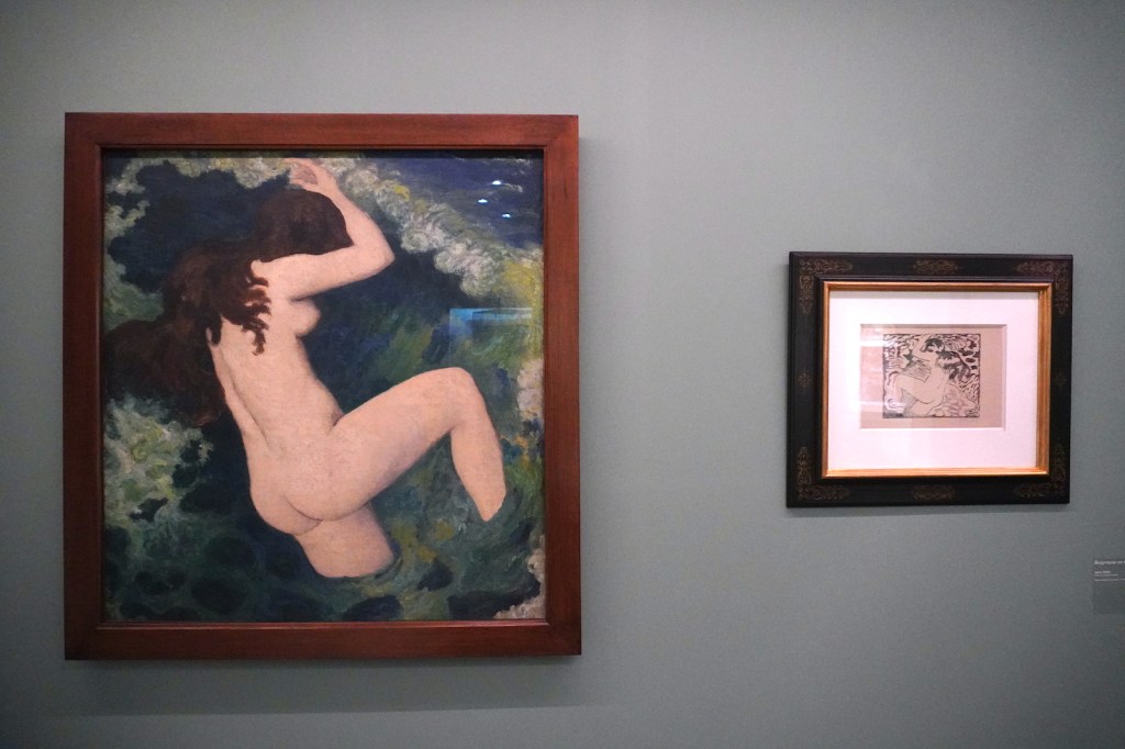 La grande surprise de l’exposition nous saisit dès l’entrée, puisque tout débute avec les peintures d’Aristide Maillol. Eh non, il n’était pas seulement sculpteur ! Ses nombreux carnets de croquis exposés laissent d’ailleurs entrevoir son trait, délicat et puissant. J’ai été particulièrement sensible à la lumière émanant de ses toiles, à la subtilité de ses motifs, à la douceur des paysages et surtout à ces femmes magnifiées. Toutes de profil. Il s’illustrera ensuite dans la tapisserie et la céramique, avant de trouver sa vocation dans la statuaire.