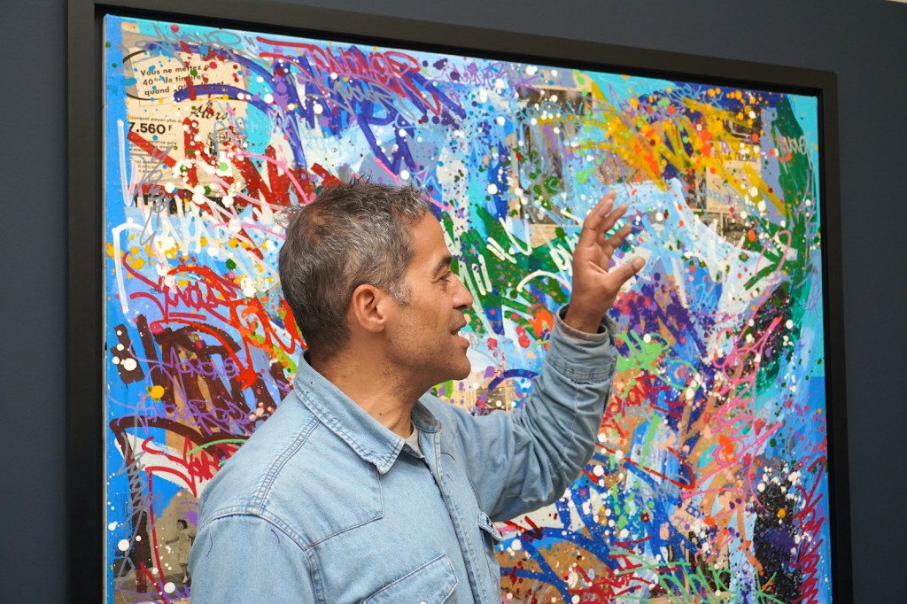 Quand l’artiste parle de sa démarche, de sa passion pour son travail, le temps s’arrête. « Je suis possédé par la peinture, j’y pense jour et nuit », explique-t-il, avec un enthousiasme contagieux. De sa découverte du graffiti à Harlem à son arrivée à Paris dans les années 1980 et son installation à Roubaix, il en a des anecdotes à livrer. Toujours avec simplicité et sourire, à l’américaine. Pionnier du graffiti, il officie désormais à Roubaix où il aime « la ville, ses habitants et son énergie » et c’est ici même qu’il développe son style aux couleurs fulgurantes sur des toiles.