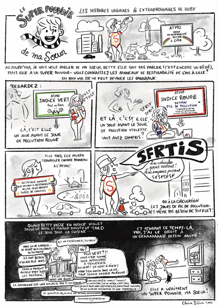 Il était une fois… Boby. Si cette histoire peut être racontée à la façon d’un conte, c’est sous la forme d’une bande dessinée 100% made in Lille que cette histoire va prendre forme, grâce à vous. À l’origine, Céline, une maman lilloise qui, depuis la naissance de ses enfants (et notamment en découvrant l’asthme de sa fille), a pris conscience des problématiques de la vie citadine. La jeune femme a utilisé ses talents de rédactrice et s’est entourée d’une équipe de 13 dessinateurs / artistes locaux pour transcender ces questionnements en un projet graphique qui parlera à tous : Les Histoires urbaines et extraordinaires de Boby. Et la bonne nouvelle, c’est que vous pouvez y prendre part. Je vous explique tout !