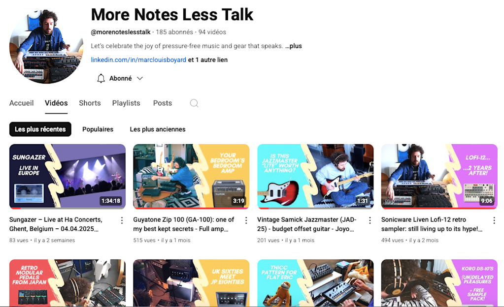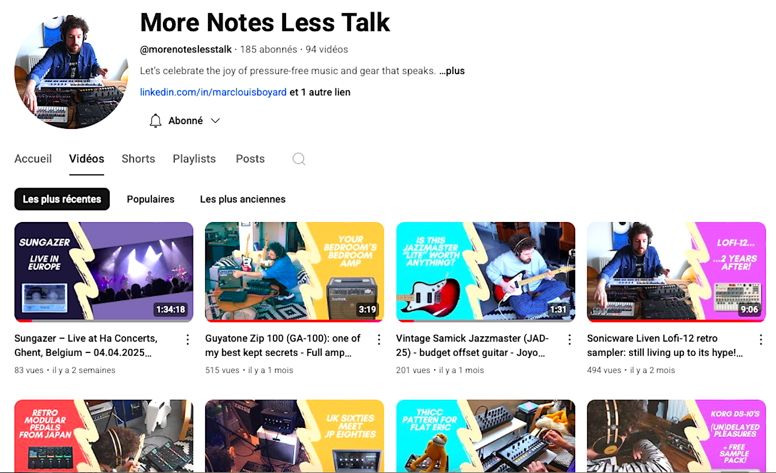Dans sa description, le ton est tout de suite donné : « Vous aimez le vintage et les instruments modernes de qualité ? Vous êtes au bon endroit. J’explore des amplis, pédales, synthétiseurs, guitares, basses, enceintes et baffles de caractère, des classiques de la vieille école aux incontournables modernes. Passionné de tubes et de sons tactiles, je présente parfois des éléments de ma collection dans différentes configurations. » Avec la curiosité inépuisable qui le caractérise, Marc passe beaucoup de temps à explorer l’infinité des possibles de son matériel de musique. À la manière d’un savant (pas si) fou, il compile, teste, expérimente et enregistre inlassablement des heures de sons sur des bandes à l’aide d’un magnétophone. Le résultat est parfois déroutant, souvent saisissant mais toujours réussi ! Je vous invite à fureter sur sa chaine YouTube et à vous laisser porter par l’expérience musicale qui ne vous laissera pas indifférent. En bonus, vous apercevrez parfois Serge, notre chat orange !