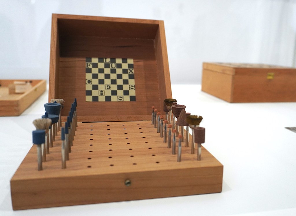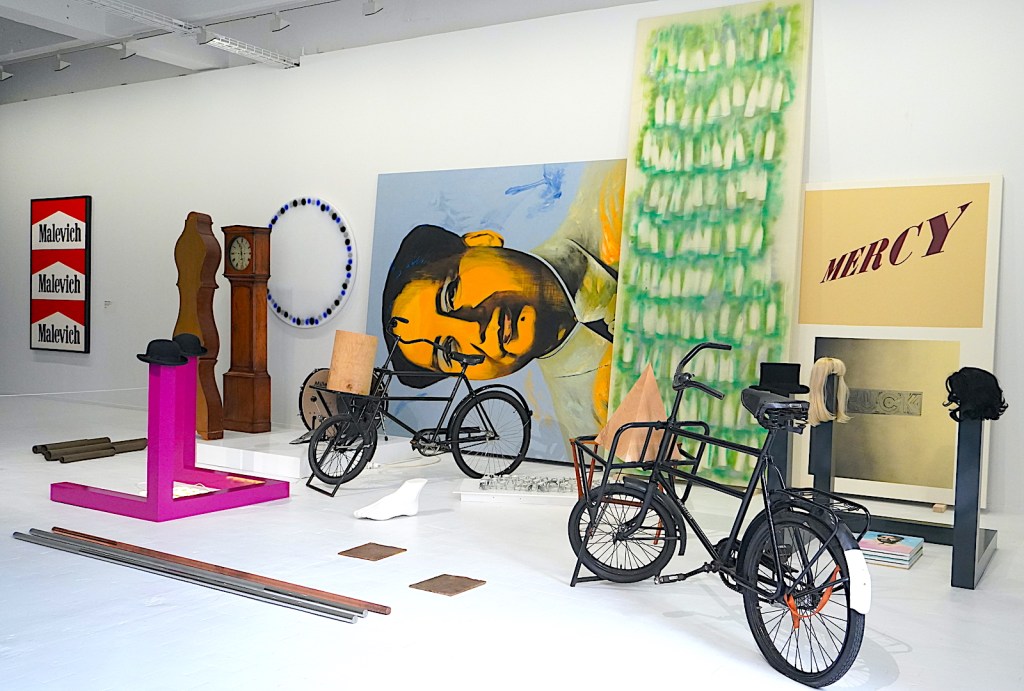 Que serait l’art s’il ne faisait pas bouger les lignes ? C’est précisément ce que montre l’exposition, en commençant par les motifs abstraits des Delaunay (monsieur ET madame, c’est assez rare pour le souligner), la décomposition des mouvements des Futuristes et, bien entendu, les célèbres ready made de Marcel Duchamp. Avec cet acte fort, c’est l’intention qui fait l’œuvre. Au premier étage, avec le mouvement Dada, l’œuvre est le résultat de l’exploration de l’inconscient. Dans la salle suivante, les membres de Fluxus décrètent que l’œuvre est un état d’esprit, voire un acte. Chez les Nouveaux Réalistes, l’œuvre est réalité quotidienne. Les artistes de la Figuration narrative prônent quant à eux un retour au savoir-faire et à la peinture. Au dernier étage, les bandes jaunes de l’installation signée Daniel Buren déconstruisent encore en s’abstenant de toute émotion tout en révélant l’espace.