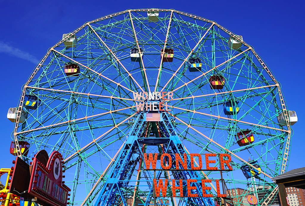 Ceux qui ne savent pas que la plage de Coney Island est mon endroit préféré au monde ne me connaissent pas vraiment :-). Encore un paradoxe totalement assumé puisque j’ai beau ne pas être fan des parcs d’attraction, me balader dans le Luna park est un de mes plaisirs favoris. Déjà parce qu’il évoque Wonder Wheel, le film de Woody Allen où la roue fait littéralement partie du casting. Dans ce long-métrage, la colorimétrie est dense et saturée et c’est précisément cet éclat qui colore mes souvenirs… et mes photos. Entre un manège et une diseuse de bonne aventure en vitrine, c’est tout le charme du vintage qui s’empare de mes rétines. La balade évoque des heures chaudes et moites passées sur le bord de mer, et se finit systématiquement par un menu roboratif chez Nathan’s, entourés de mouettes affamées.